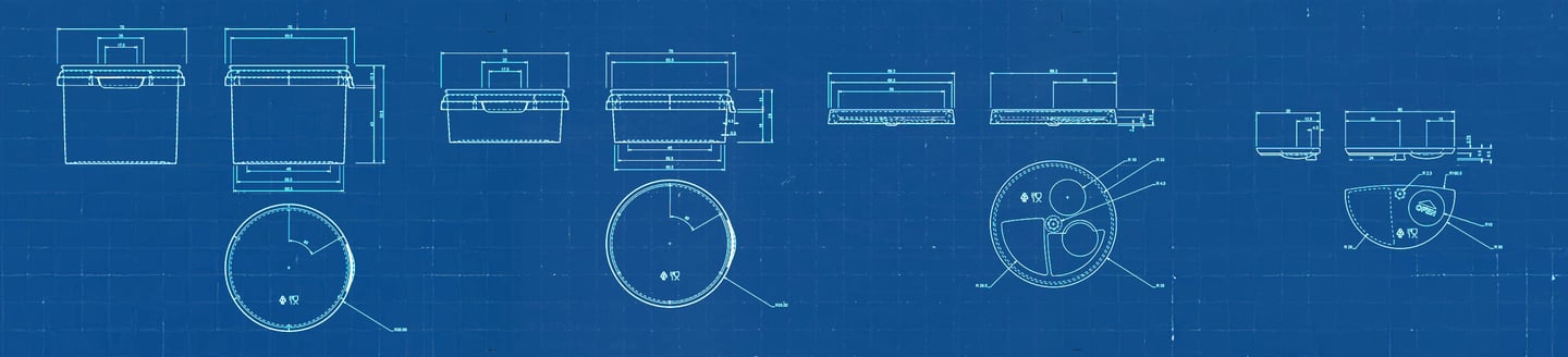 Early hand sketches exploring disposable sauce container form and lid mechanisms.